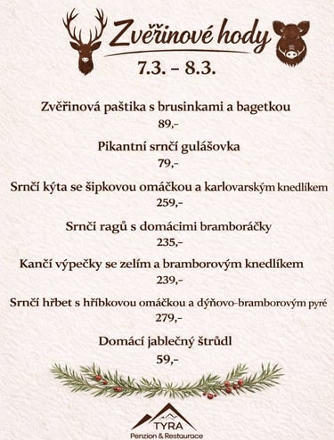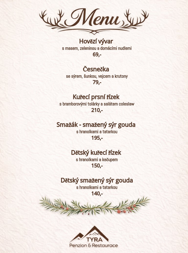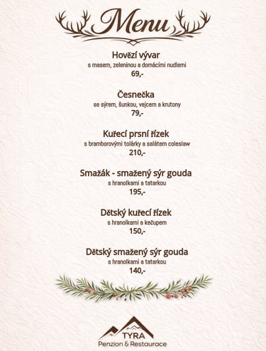Náš penzion a restaurace Tyra v malebné vesničce v Beskydech nedaleko města Třince je ideálním místem pro relaxaci, odpočinek a rodinnou dovolenou. Nabízíme pohodlné ubytování a stylovou restauraci s terasou a altánem.