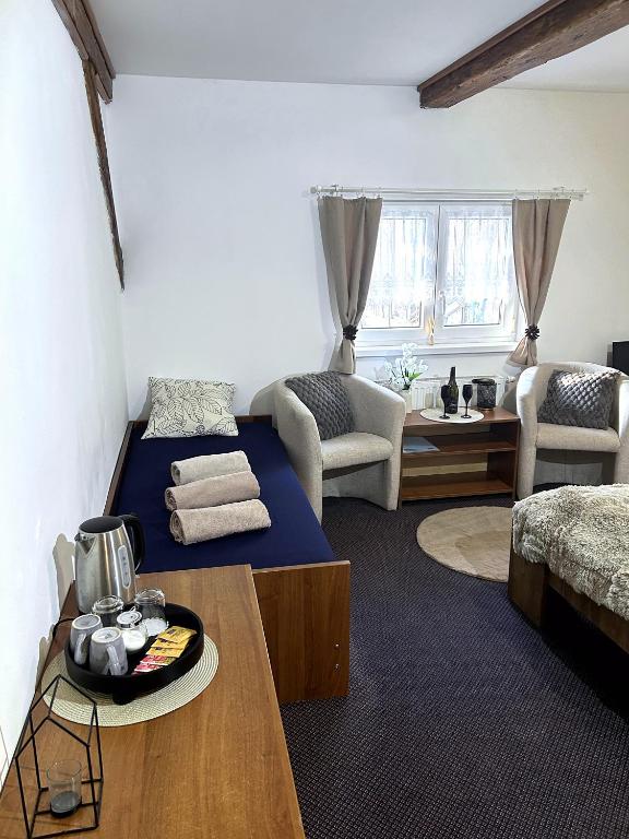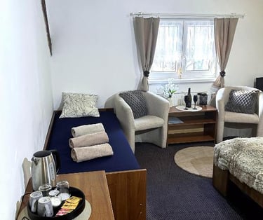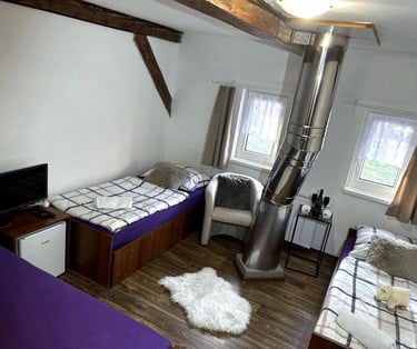 Komfortní rodinný pokoj s výhledem na přírodu, ideální pro relaxaci a odpočinek po aktivním dni stráveném v Beskydech. Pokoj je rozdělený do dvou místností, ve kterých najdete jednu manželskou postel a dvě oddělené postele. Součástí pokoje je koupelna se sprchovým koutem a toaletou.